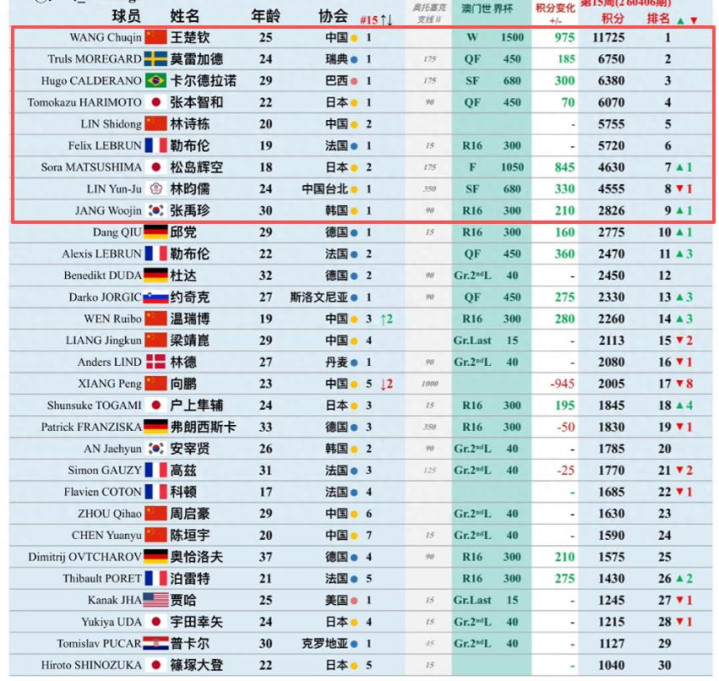 王楚钦澳门天下杯封王,11725的最新积分,四字描摹驴年马月,张本智和、松岛辉空争夺天下第一的好意思梦,稀碎一地。