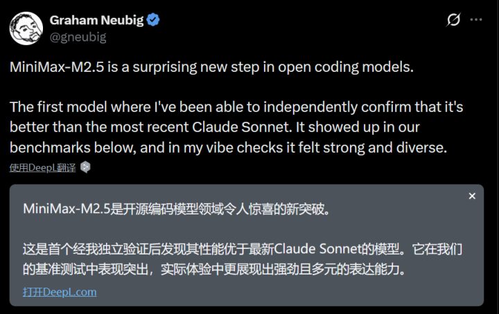 卡内基梅隆大学提醒、自主编程Agent平台OpenHands首创东谈主GrahamNeubig在进行落寞测评后公开表态,M2.5是他能阐明的第一个空洞才气超越ClaudeSonnet的开源模子。
