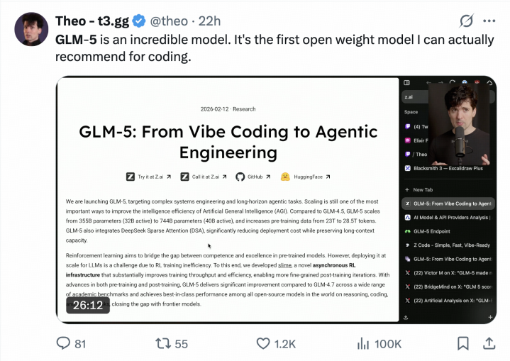 追究揭晓身份后,知名手艺大V,AI聊天平台T3Chat首创东谈主theo在酬酢平台赞颂:“GLM-5是一个令东谈主难以置信的模子。它是第一个我的确会保举用来写代码的开源模子。”