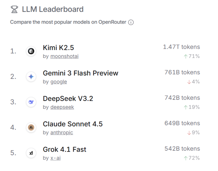 值得贯注的是,在KimiK2.5发布后,在追踪大模子推行调用的OpenRouter平台上,Kimi在调用量上超越了谷歌Gemini3和Anthropic的Claude模子,握续霸榜调用量榜首的地位。