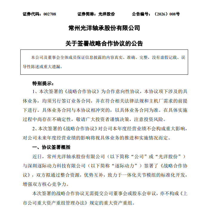 3月9日,光洋股份(002708.SZ)公告称,近日,公司与深圳逐际能源科技有限公司(简称“逐际能源”)签署了《计谋结合合同》,九游体育官方网站两边拟通过整搭伙源,上风互补,勉力于一体化枢纽模组的交替化成就,增强两边中枢竞争力。结合家具:包括但不限于轴承,齿轮、延缓机、运转器等环节零部件以及一体化枢纽模组野心的成就和代加工。