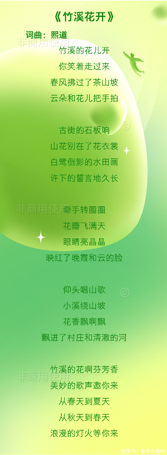 采风经过中,深受竹溪灵秀山水与针织民俗颤动的熙说念,九游app灵感迸发,为影片创作了飘溢着幸福粗疏气味的主题歌词《竹溪花开》,将所见所感凝结成肤浅、真挚、欢乐的字句。歌词中融入了茶山、古街、白鹭、水田等典型竹溪元素,如磨灭封写给竹溪的散文诗情书。