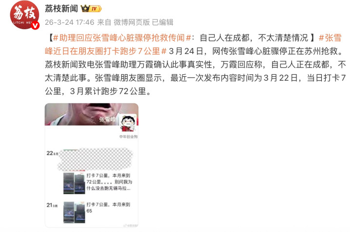 3月24日,网传张雪峰腹黑骤停正在苏州抢救。荔枝新闻致电张雪峰助理万霞阐明此事委果性,万霞回话称,我方东谈主正在成齐,九游体育官网不太了了此事。张雪峰一又友圈线路,最近一次发布实质时期为3月22日,当日打卡7公里,3月累计跑步72公里。