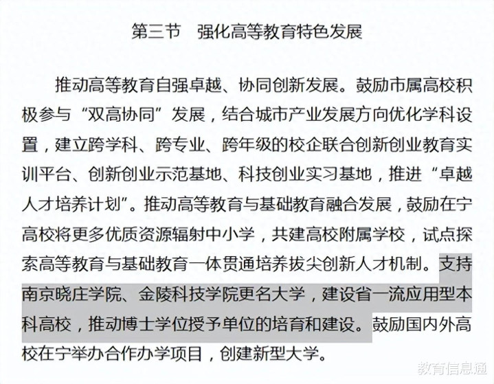 近日,《南京市国民经济和社会发展第十五个五年决议摘录》发布。摘录“建造当代化教练强市”版本忽视“复旧南京晓庄学院、金陵科技学院改名大学,建造省一流期骗型本科高校,鼓动博士学位授予单元的拔擢和建造。”
